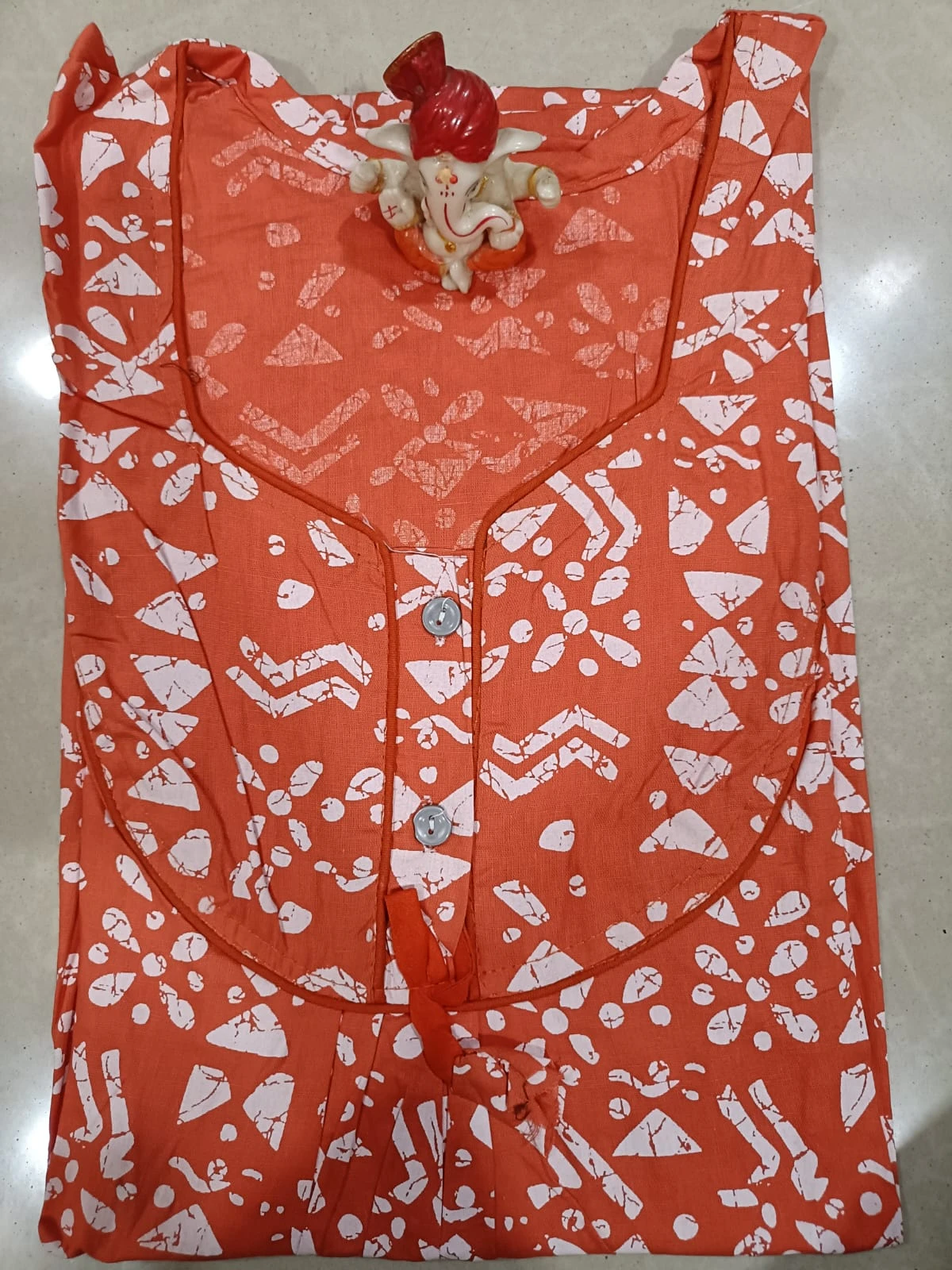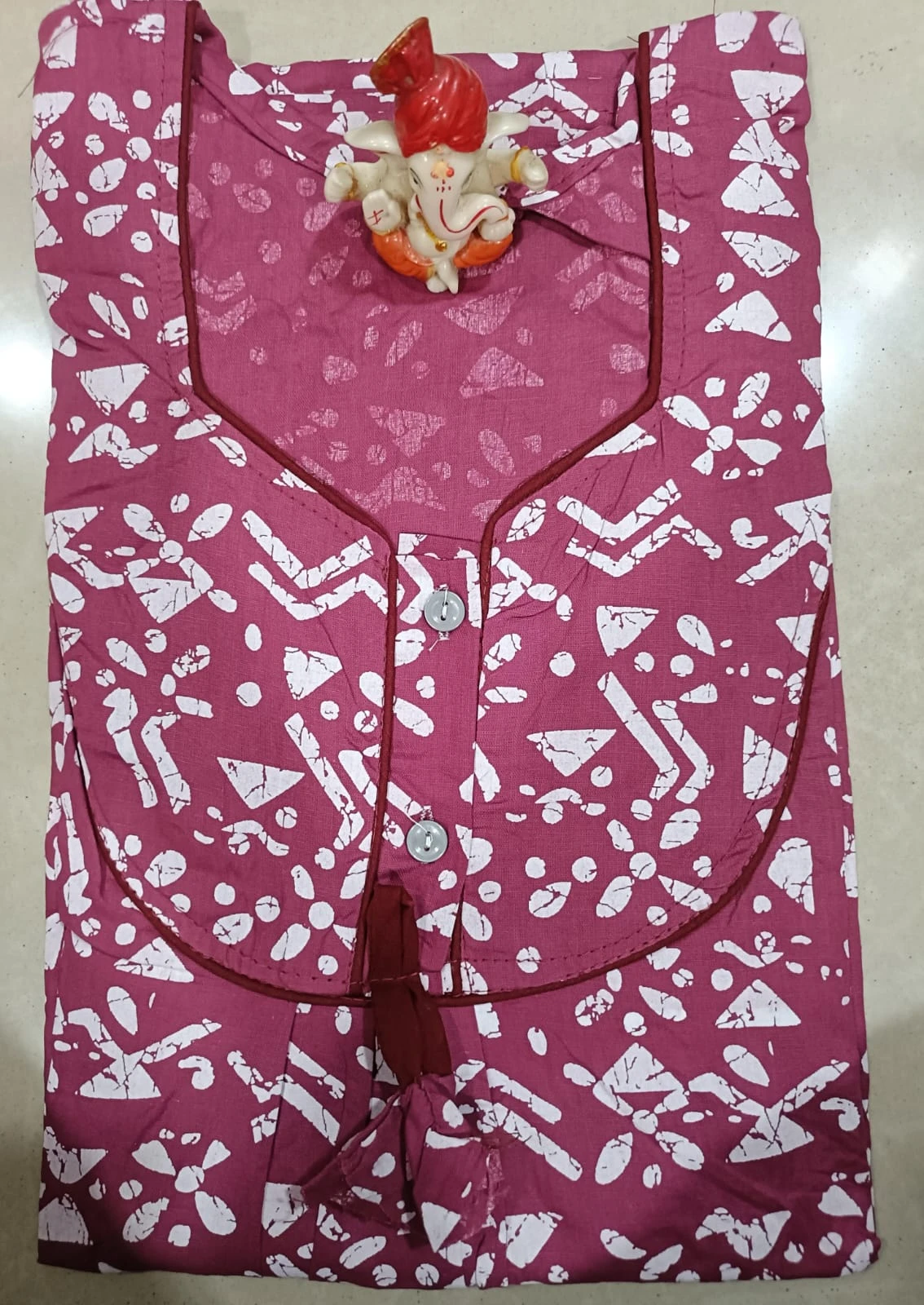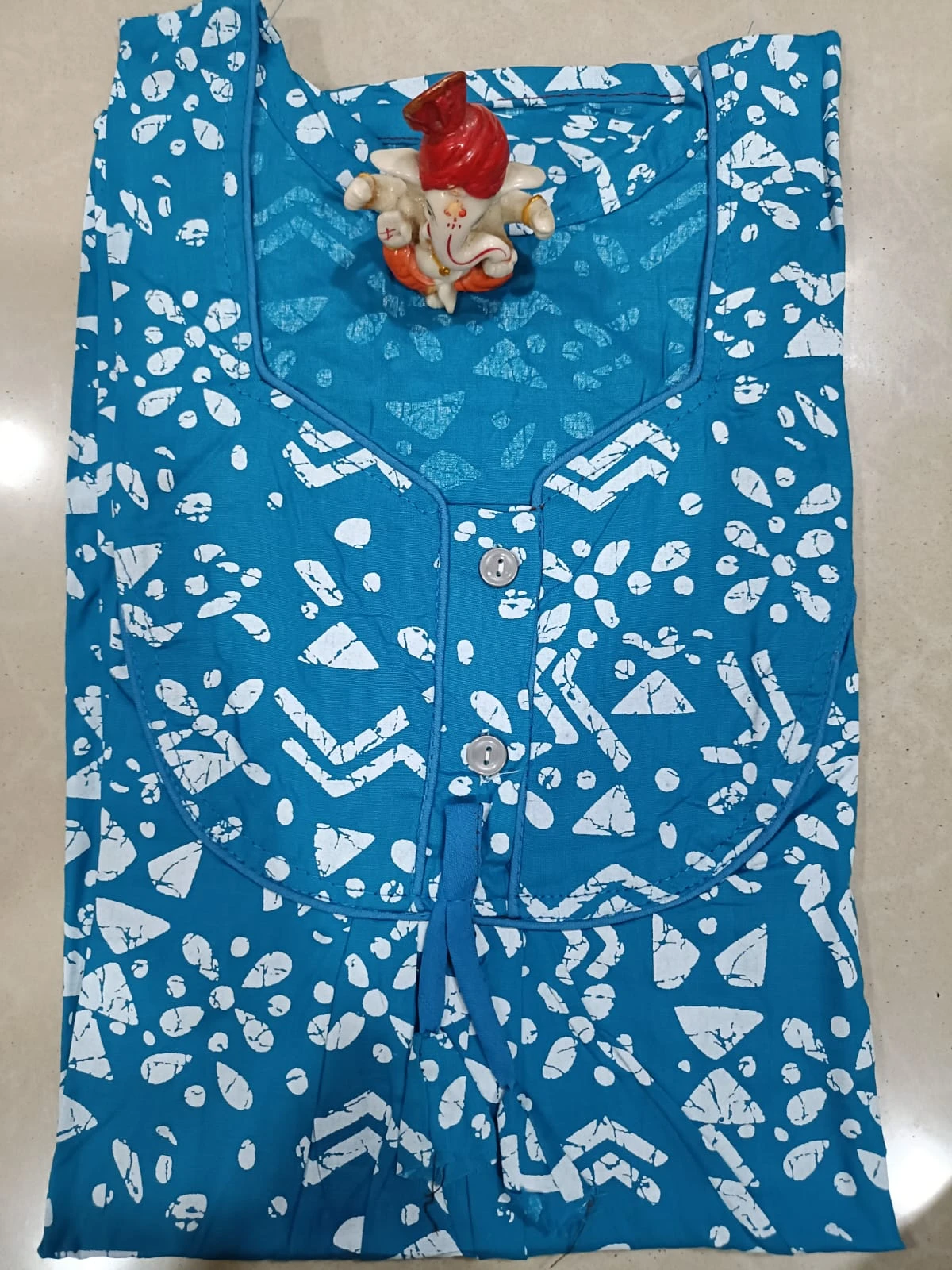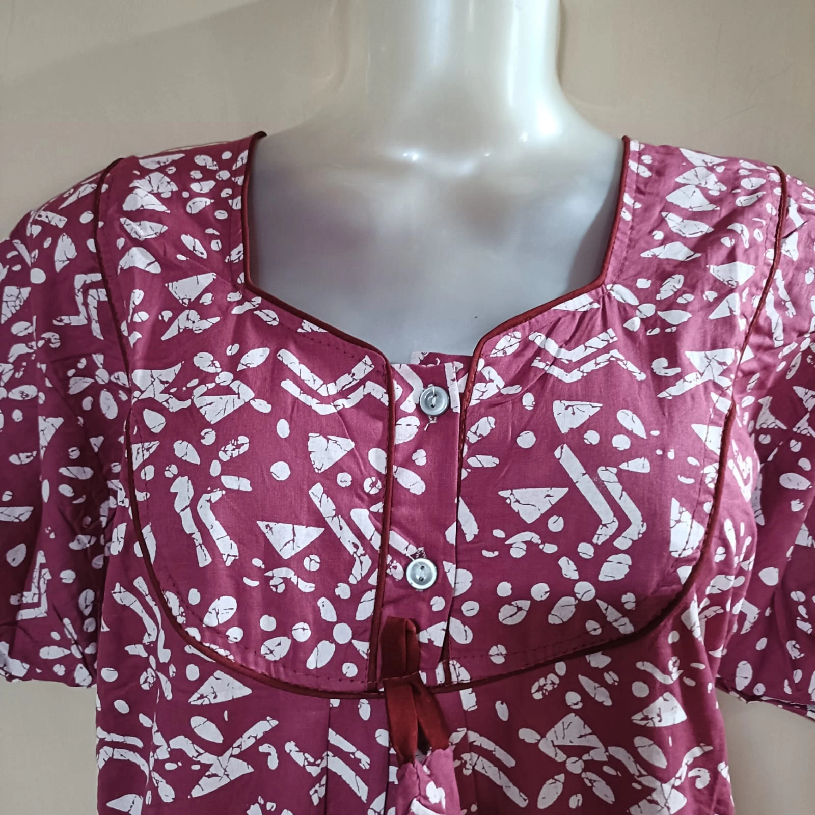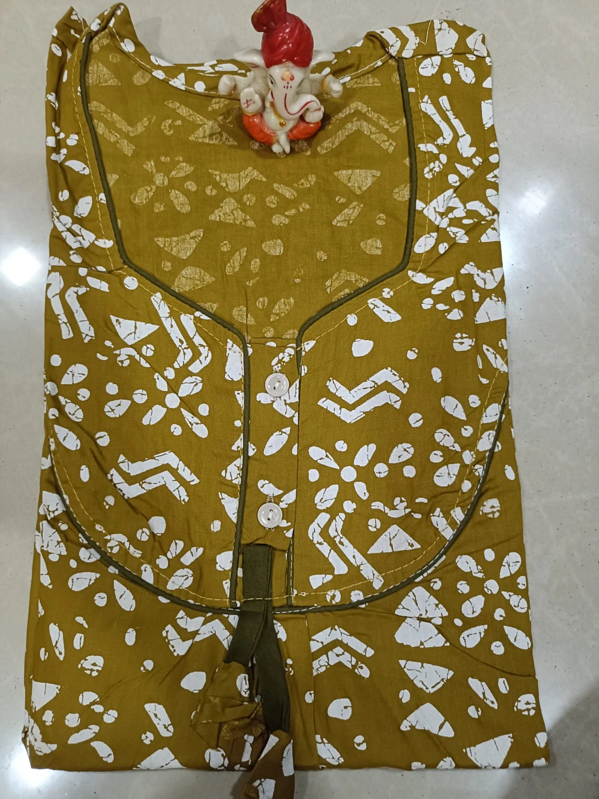 COLOUR : It is a mustard yellow color nighty with white batik-style prints and a touch of dark green piping along the neckline and button panel.