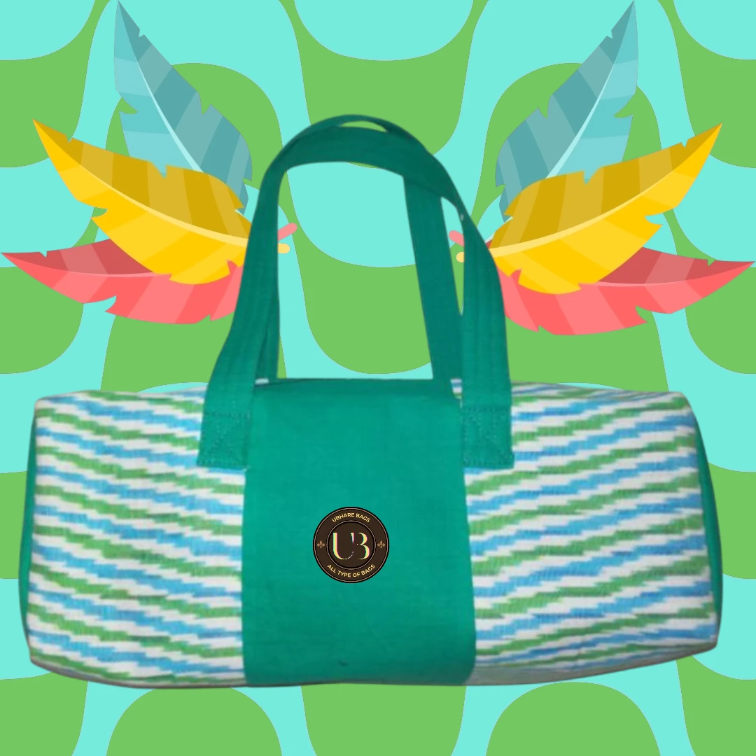 Discover the perfect blend of style, sustainability, and functionality with the UBHARE BAGS Cotton Fabric Duffel Bag. Crafted from high-quality, breathable cotton fabric, this cylindrical duffel bag features a vibrant green and white striped pattern on the sides, accented by a solid emerald green central panel for a modern, eye-catching look. The sturdy green handles provide comfortable carrying, making it ideal for weekend getaways, gym sessions, or casual outings.