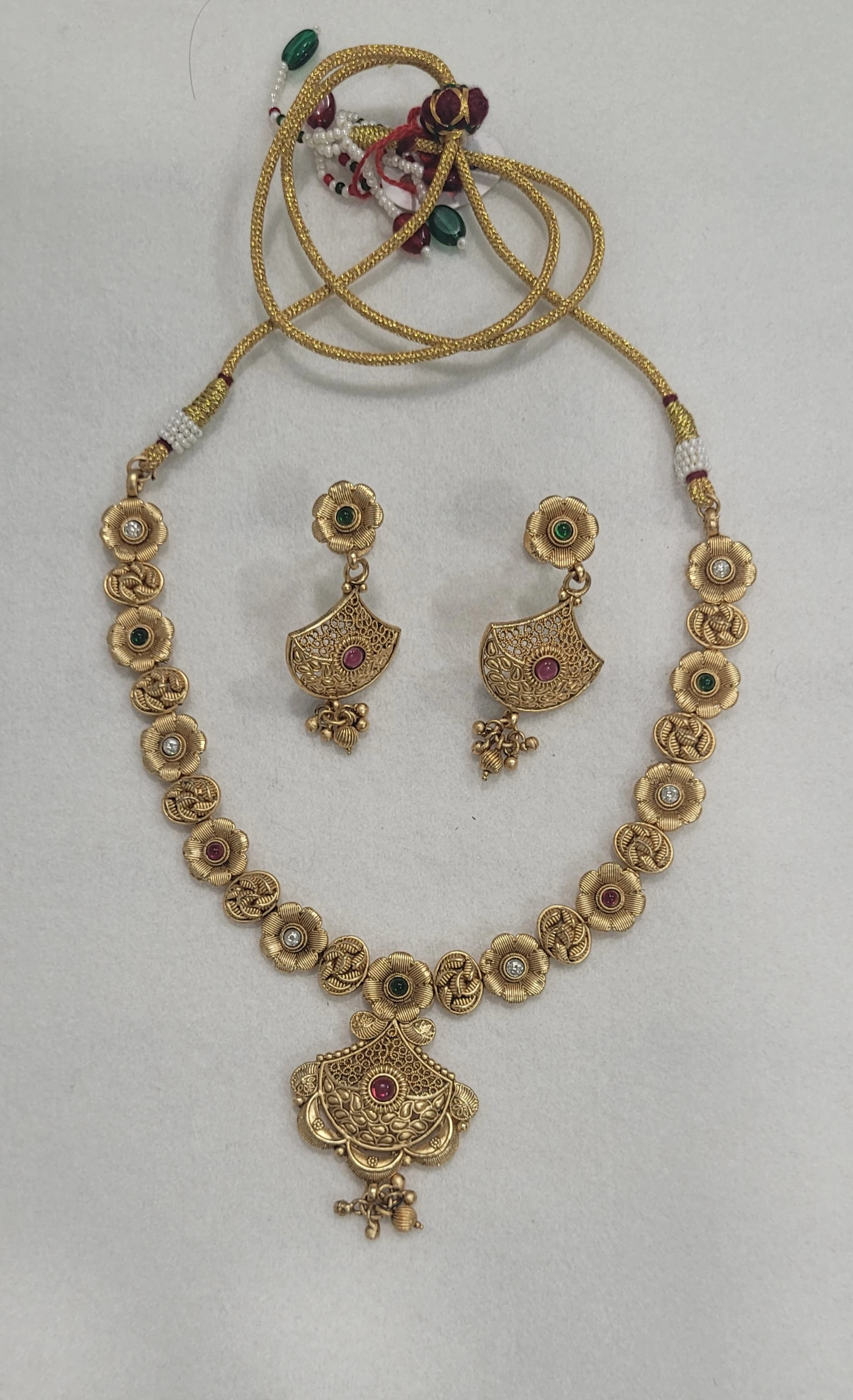 beautiful short collar necklace with matching medium size earrings. with white, pink and green stones.
