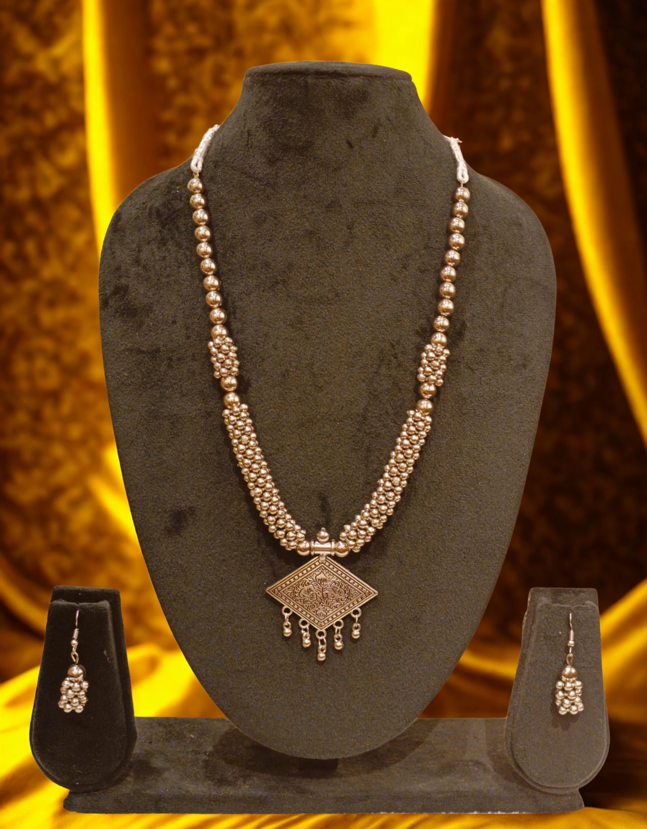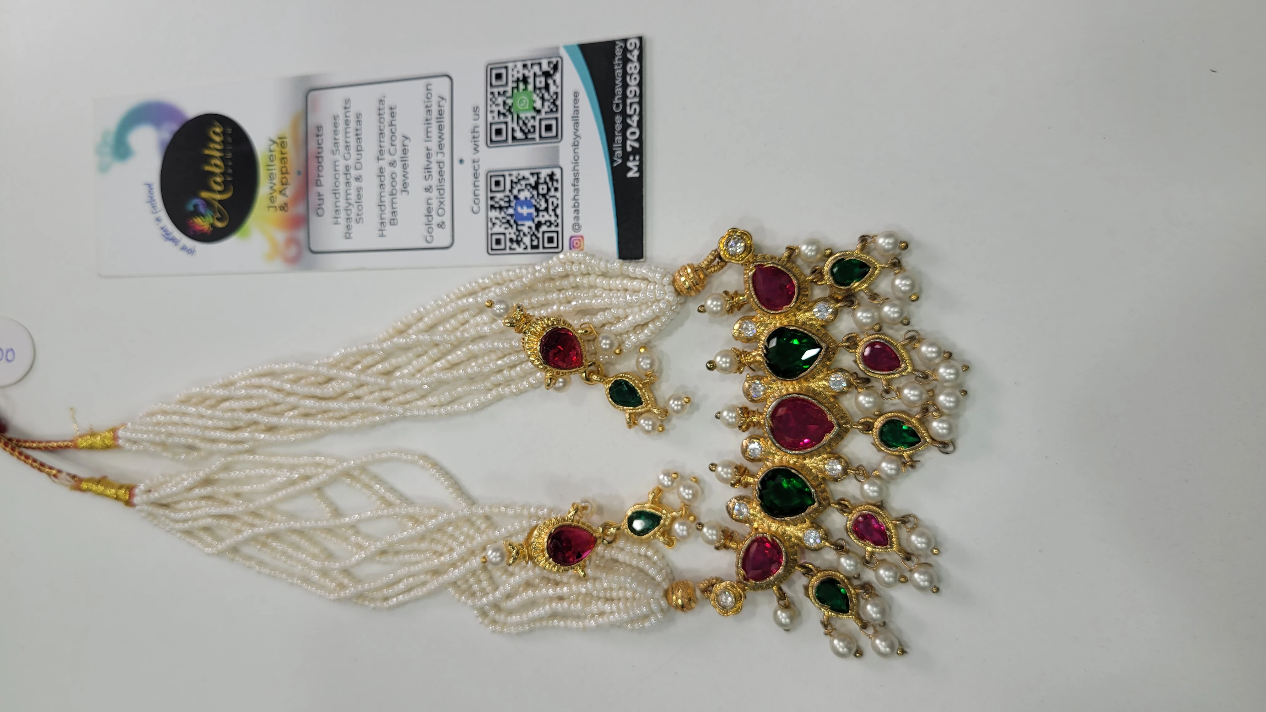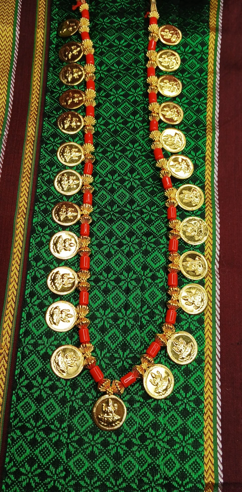 This trending Invisible Chain Mangalsutra is designed with a beautifully engraved Laxmi Putali pendant, symbolizing wealth and prosperity, along with a Dalimbi-colored thushi pendant. It is paired with matching Laxmi Putali coin earrings, making it a perfect set. The mangalsutra is extremely lightweight, delicate, and stylish, yet carries a traditional touch. Perfect to wear with cotton sarees, Irkal sarees, and festive attire, this trendy design is loved by women of all age groups – from the youth to the elder generation.