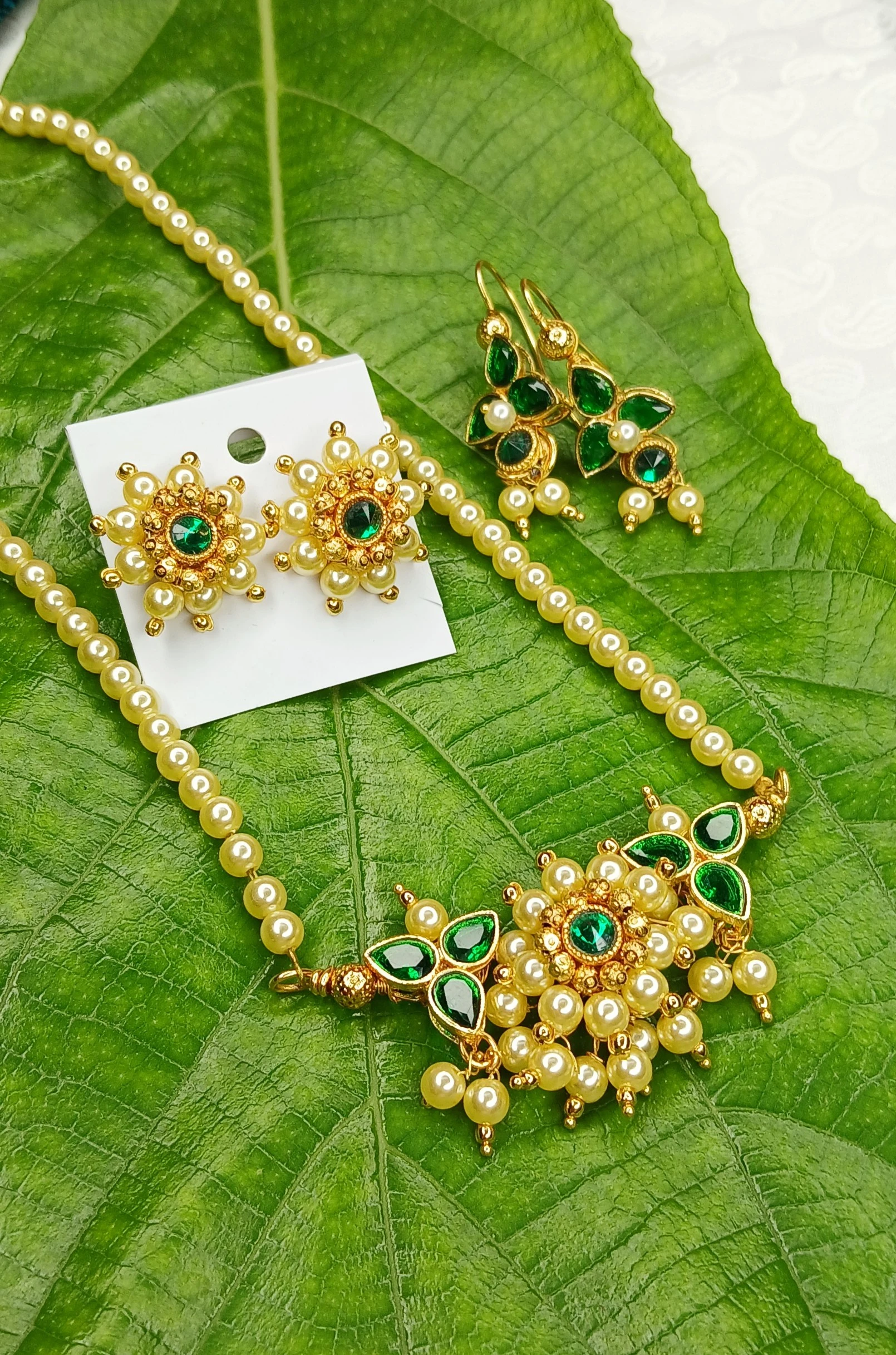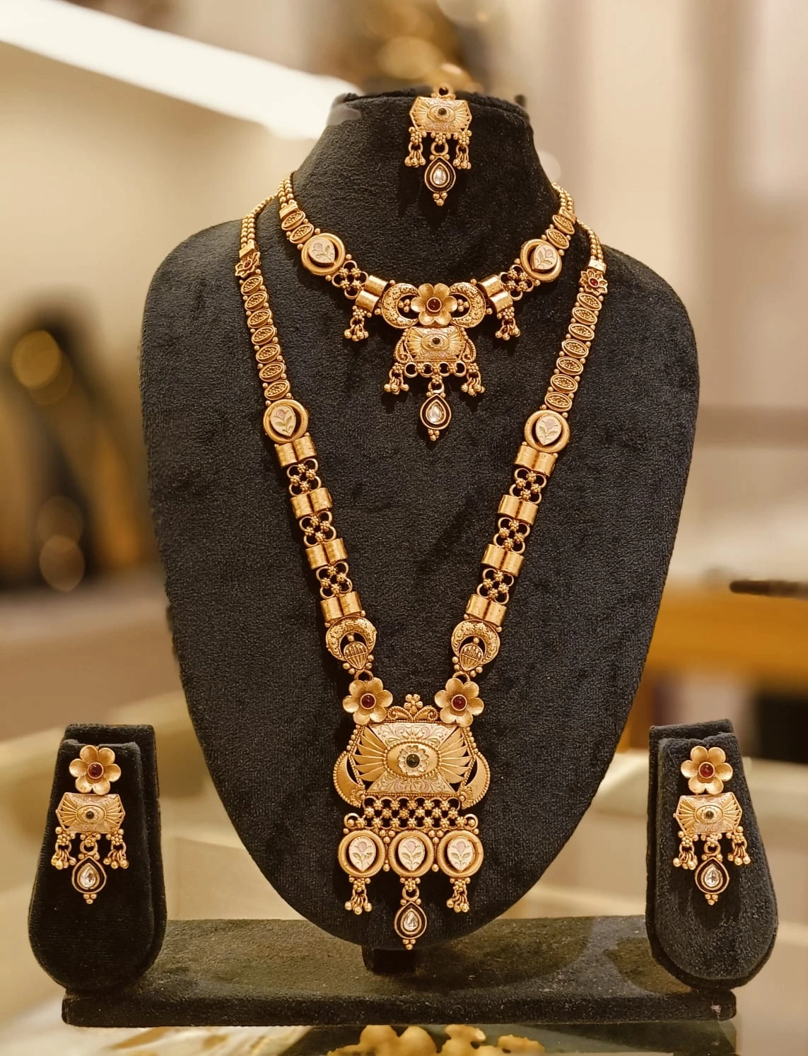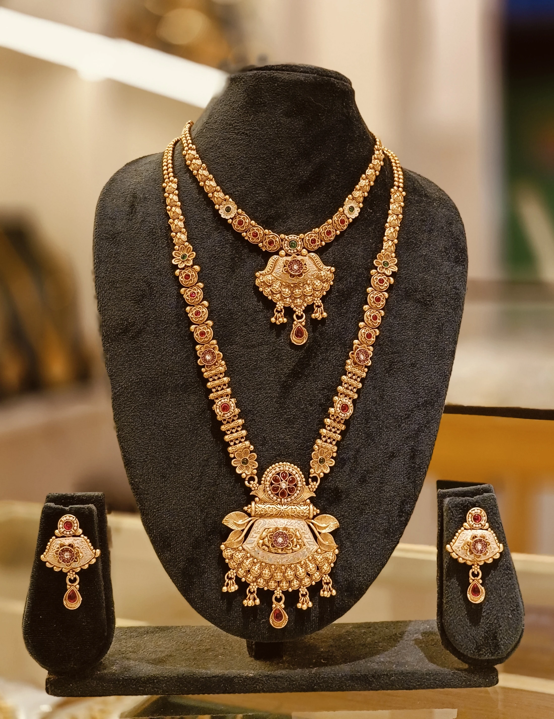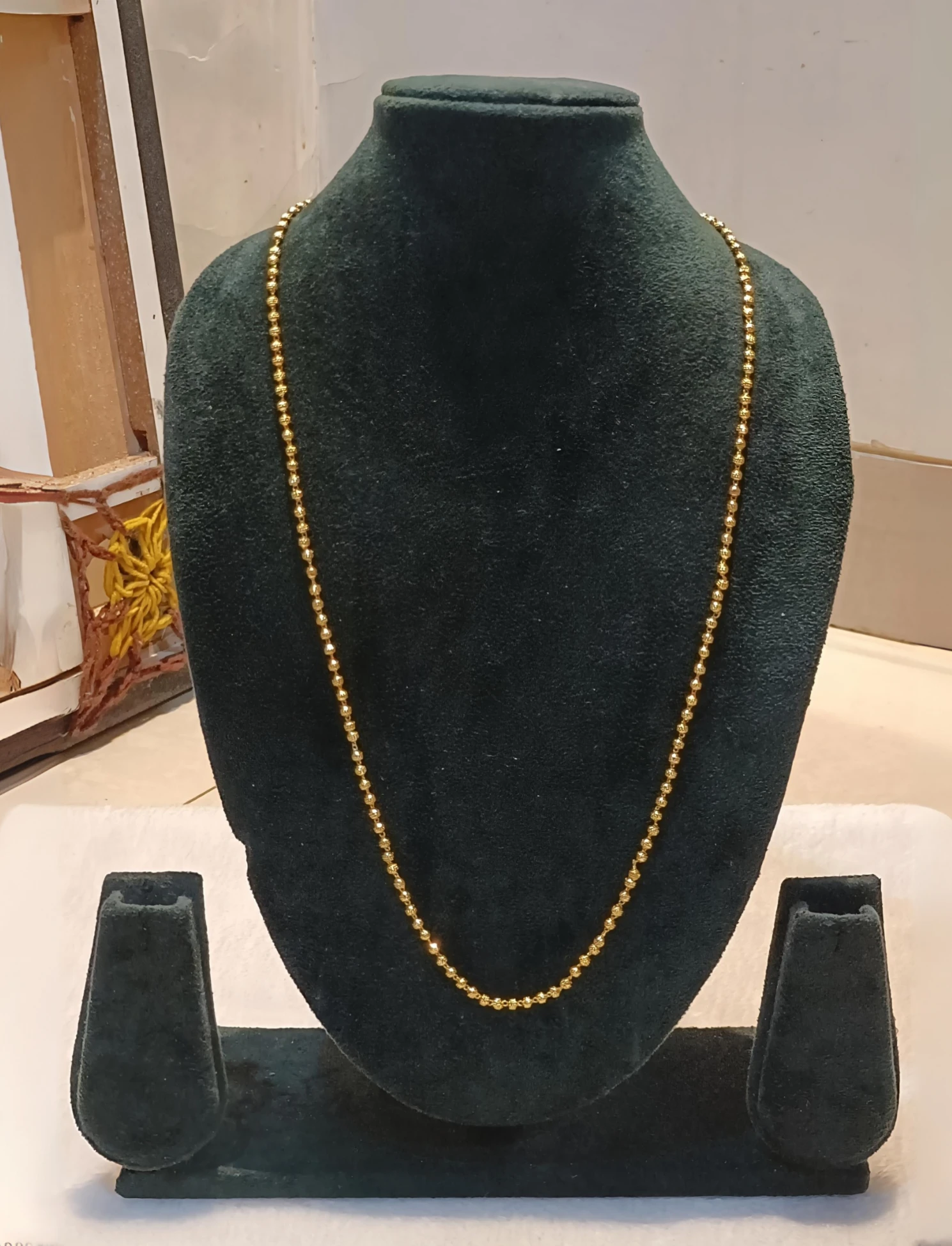 This trending Invisible Chain Mangalsutra is designed with a beautifully engraved Laxmi Putali pendant, symbolizing wealth and prosperity, along with a Dalimbi-colored thushi pendant. It is paired with matching Laxmi Putali coin earrings, making it a perfect set. The mangalsutra is extremely lightweight, delicate, and stylish, yet carries a traditional touch. Perfect to wear with cotton sarees, Irkal sarees, and festive attire, this trendy design is loved by women of all age groups – from the youth to the elder generation.
