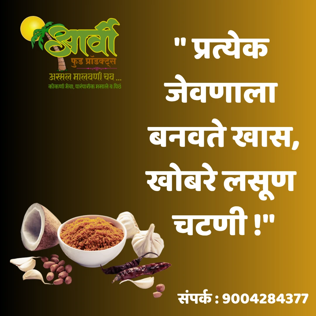 Arvi Foods Khobra Lasun Chutney is a traditional Konkani delicacy made with roasted coconut, spicy garlic, and aromatic spices. This chutney perfectly complements bhakri, chapati, rice, dal, or serves as a flavorful side dish. Prepared in a pure, homemade style without any artificial colors, flavors, or preservatives, it brings authentic taste, aroma, and a spicy twist to your meals.