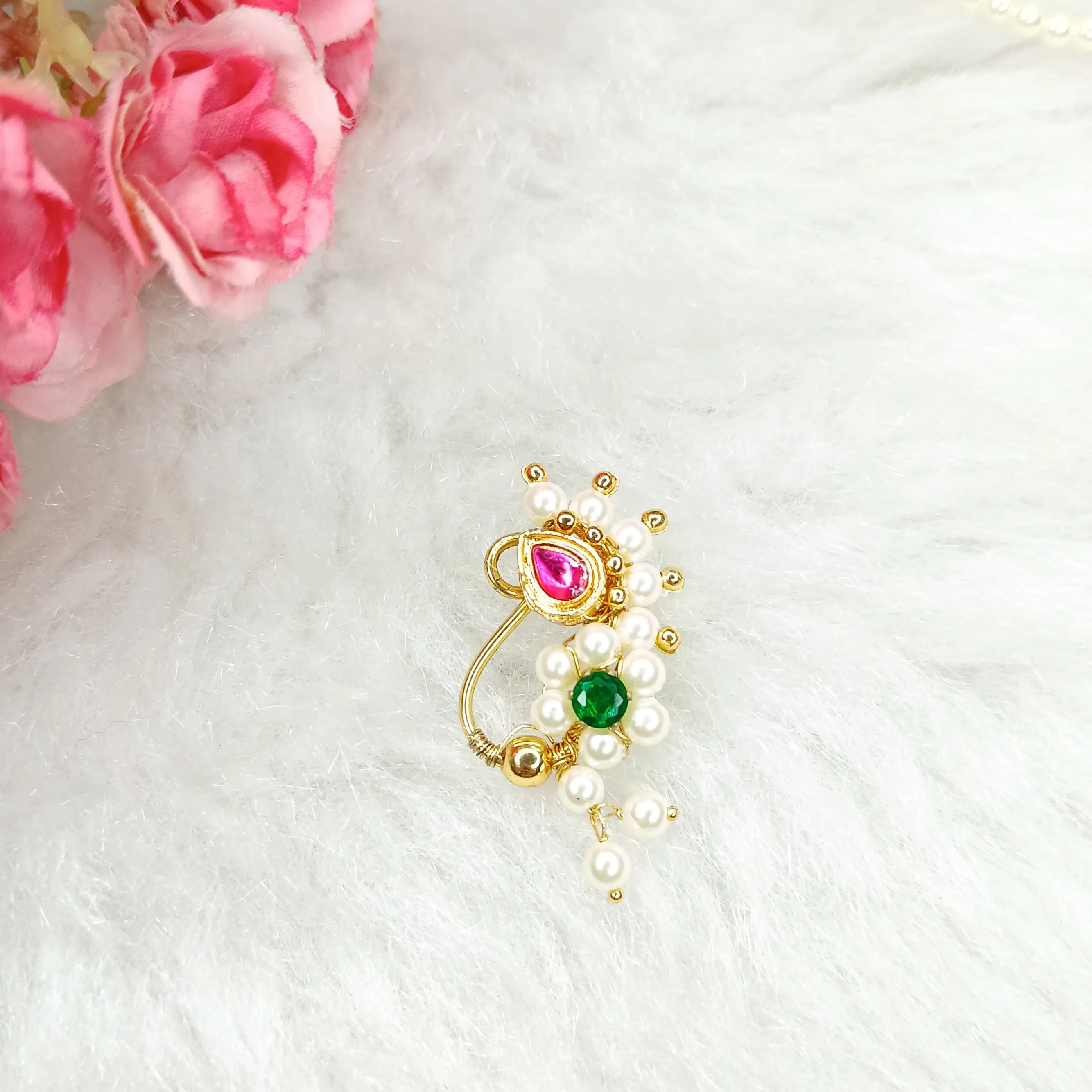 Embrace timeless Maharashtrian elegance with this handcrafted Nath, a traditional nose ornament that carries cultural pride and beauty. Measuring 4 cm in length, this Nath is intricately crafted using: