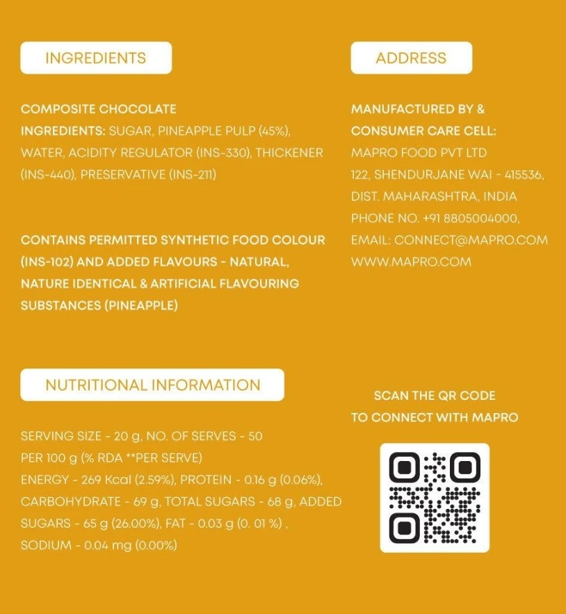 Experience the tangy-sweet delight of Mapro Real Fruit Jam – Pineapple, crafted with real pineapple pulp and absolutely no preservatives. Packed with the freshness and nutrition of real fruit, this jam is a perfect spread for bread, rotis, parathas, or desserts. Naturally flavorful and irresistibly tasty, it brings pure fruity goodness to your everyday meals.