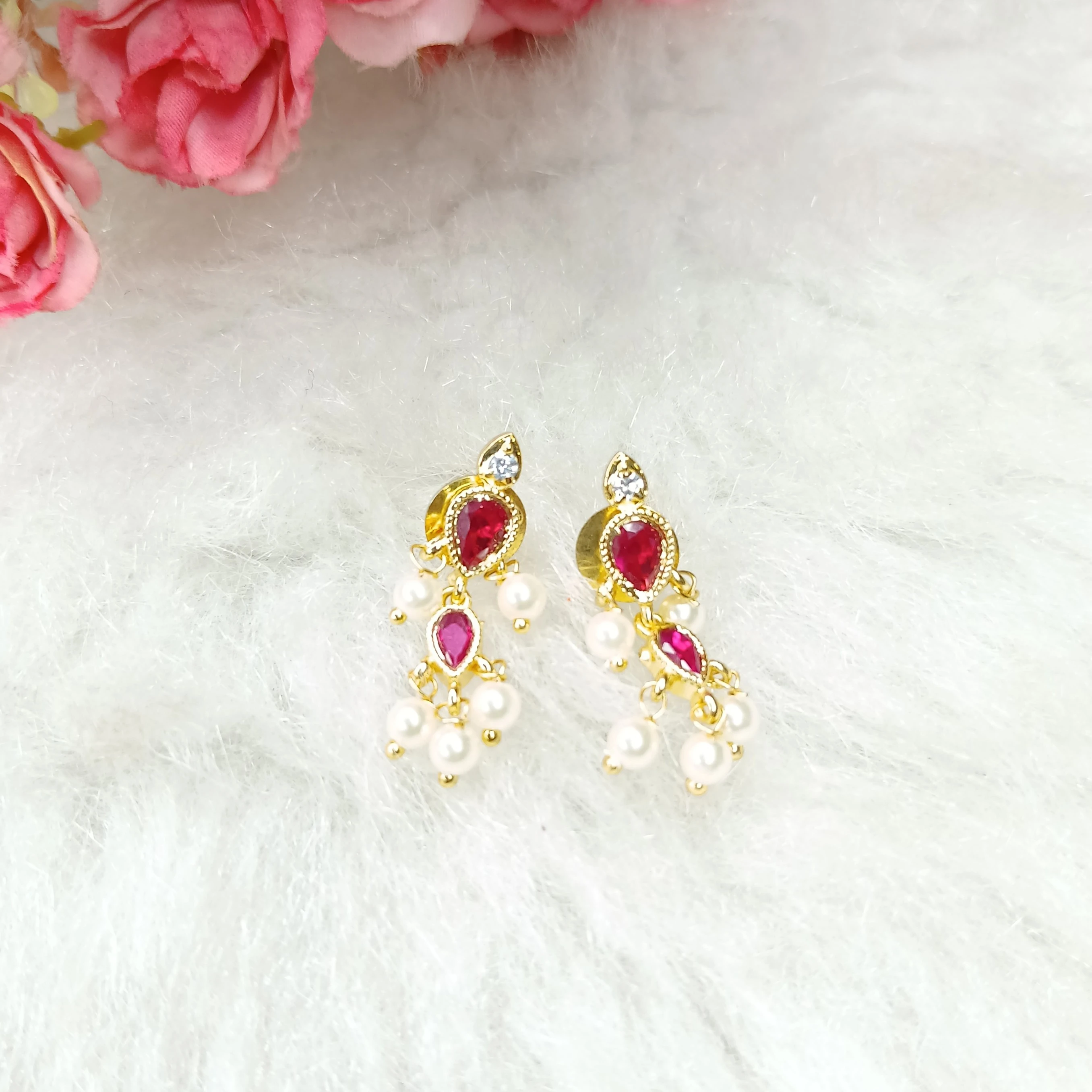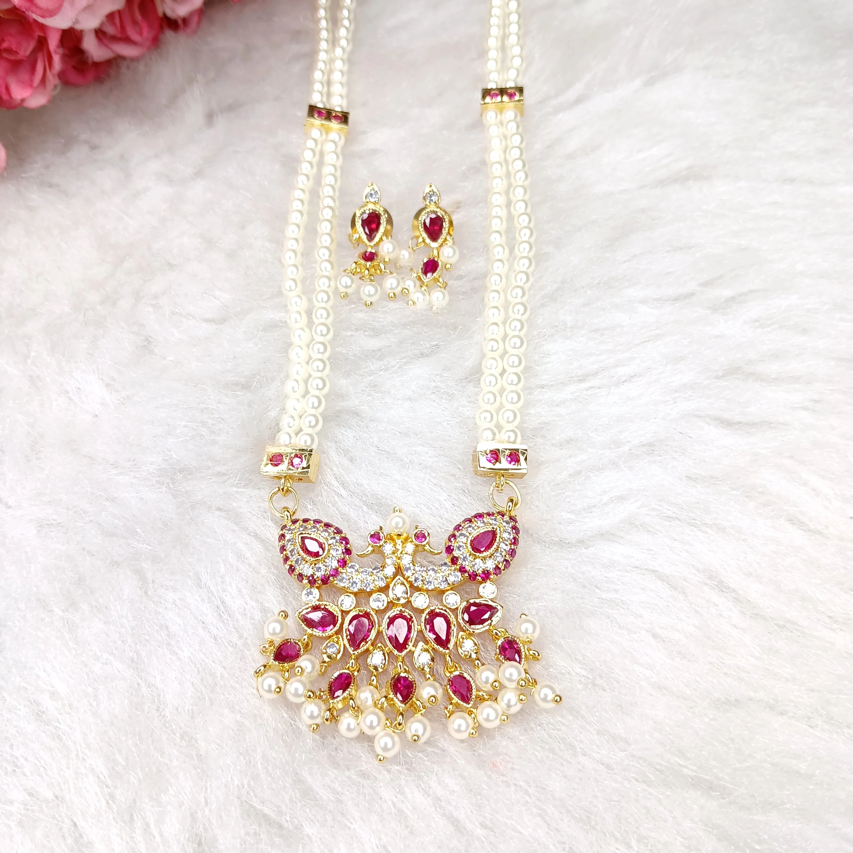 Each pendant is studded with pomegranate glow color stones, radiating a vibrant charm. The set comes complete with coordinated earrings, making it a perfect ensemble for weddings, festive occasions, and special celebrations.