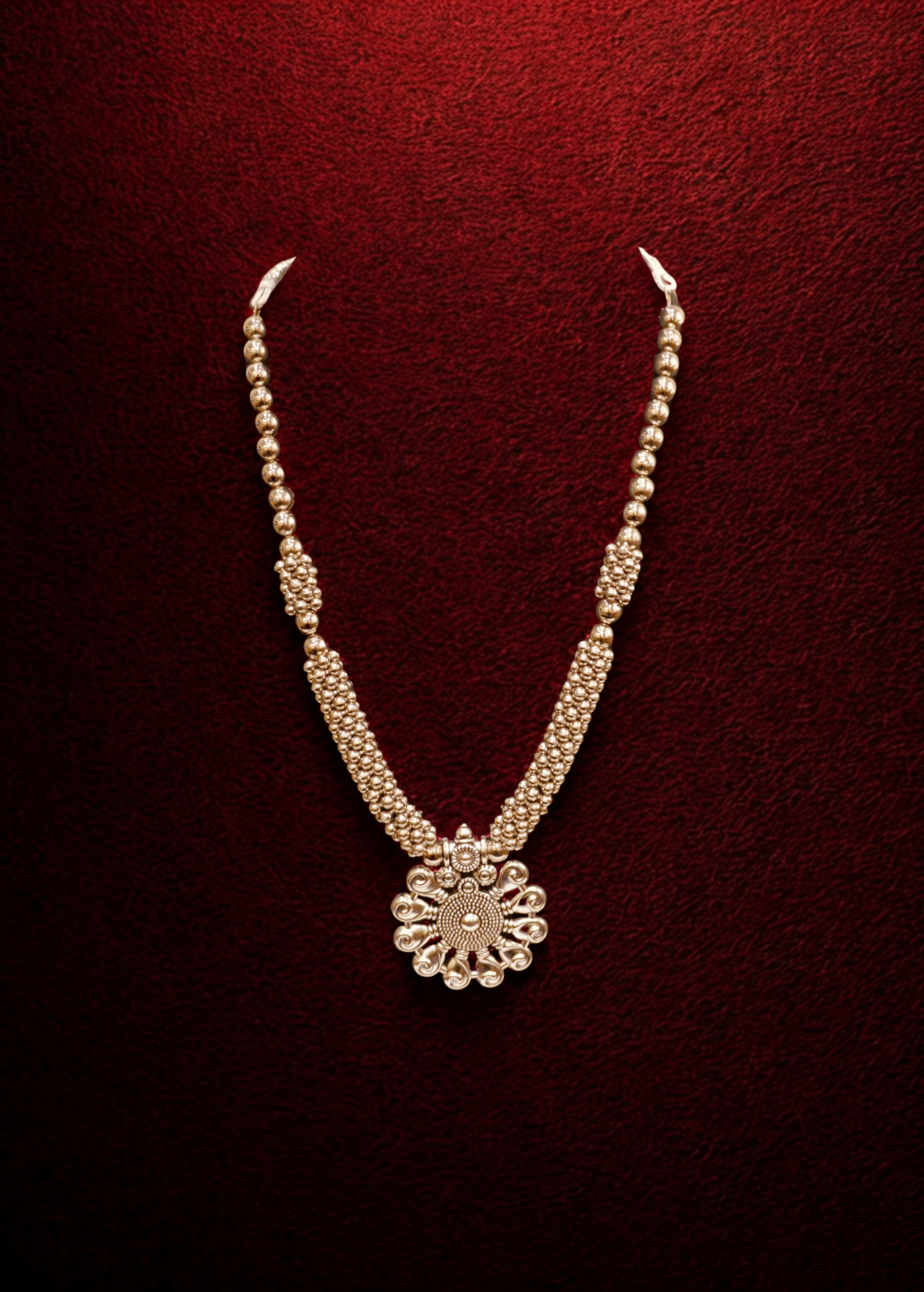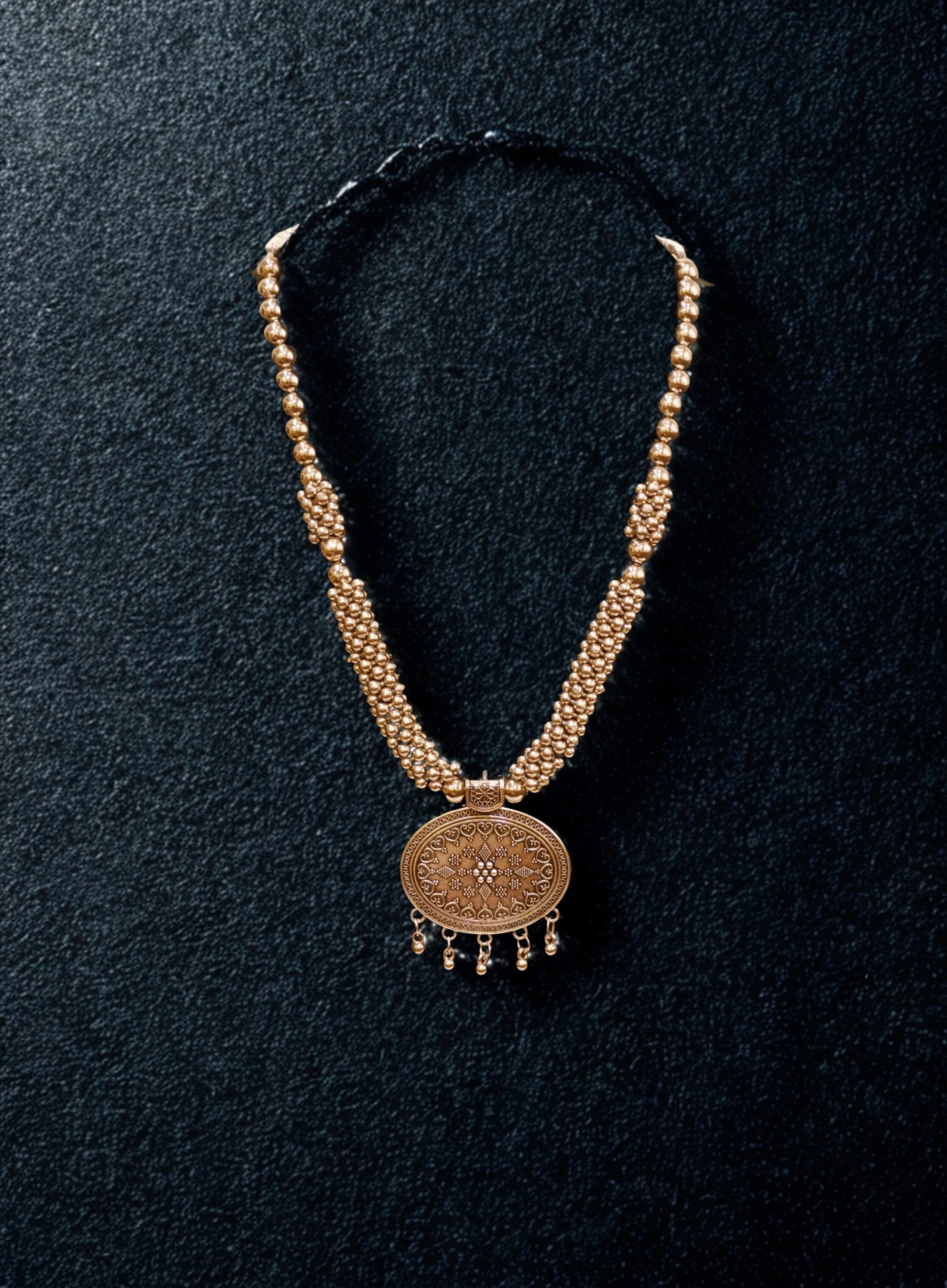 Add a touch of timeless charm to your ethnic or boho look with this stunning oxidised necklace set. Crafted with intricate detailing, this set includes a beautifully designed necklace paired with matching earrings, making it the perfect accessory for festive occasions, weddings, or casual ethnic wear.