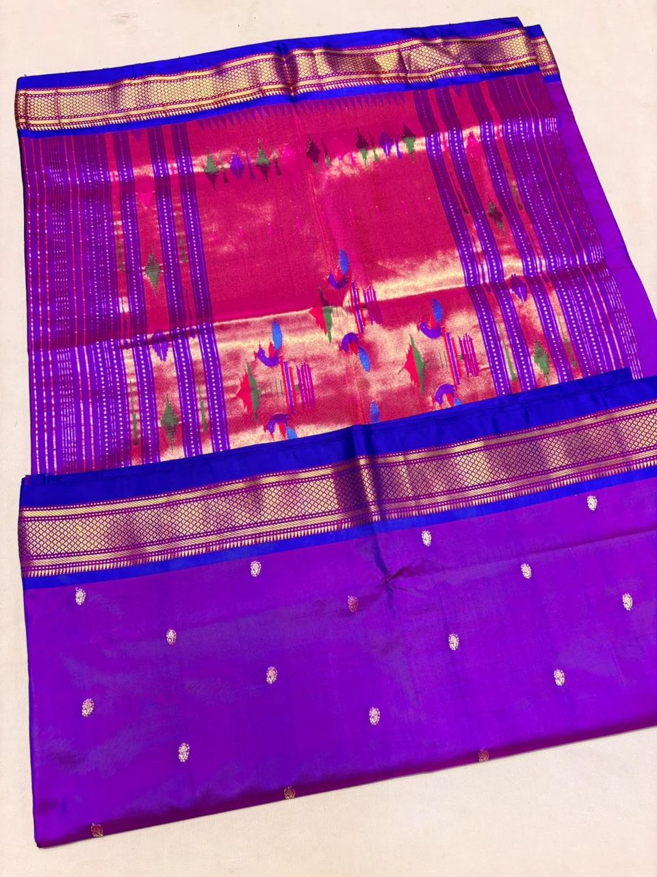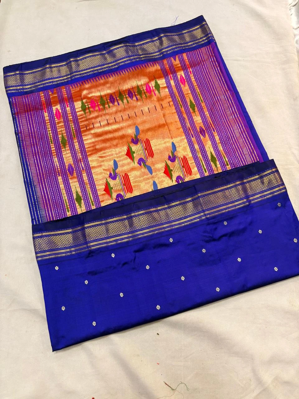 A maharashtrian wedding or puja in maharaahtrian house or any festival is incomplete if a paithani is not worn by the bride or hostess. aabha Fashion provides you with huge range of semi paithani and pure silk handloom paithani. Here we present Traditional Pure Silk Handloom Paithani made by Vinkar in Yeola. this is 14 peacock design pallu and narali border, starting range paithani. These paithani come with running blouse piece. total length is about 610 cm. height is about 44 to 45 inches. Many colors are available in this pattern.