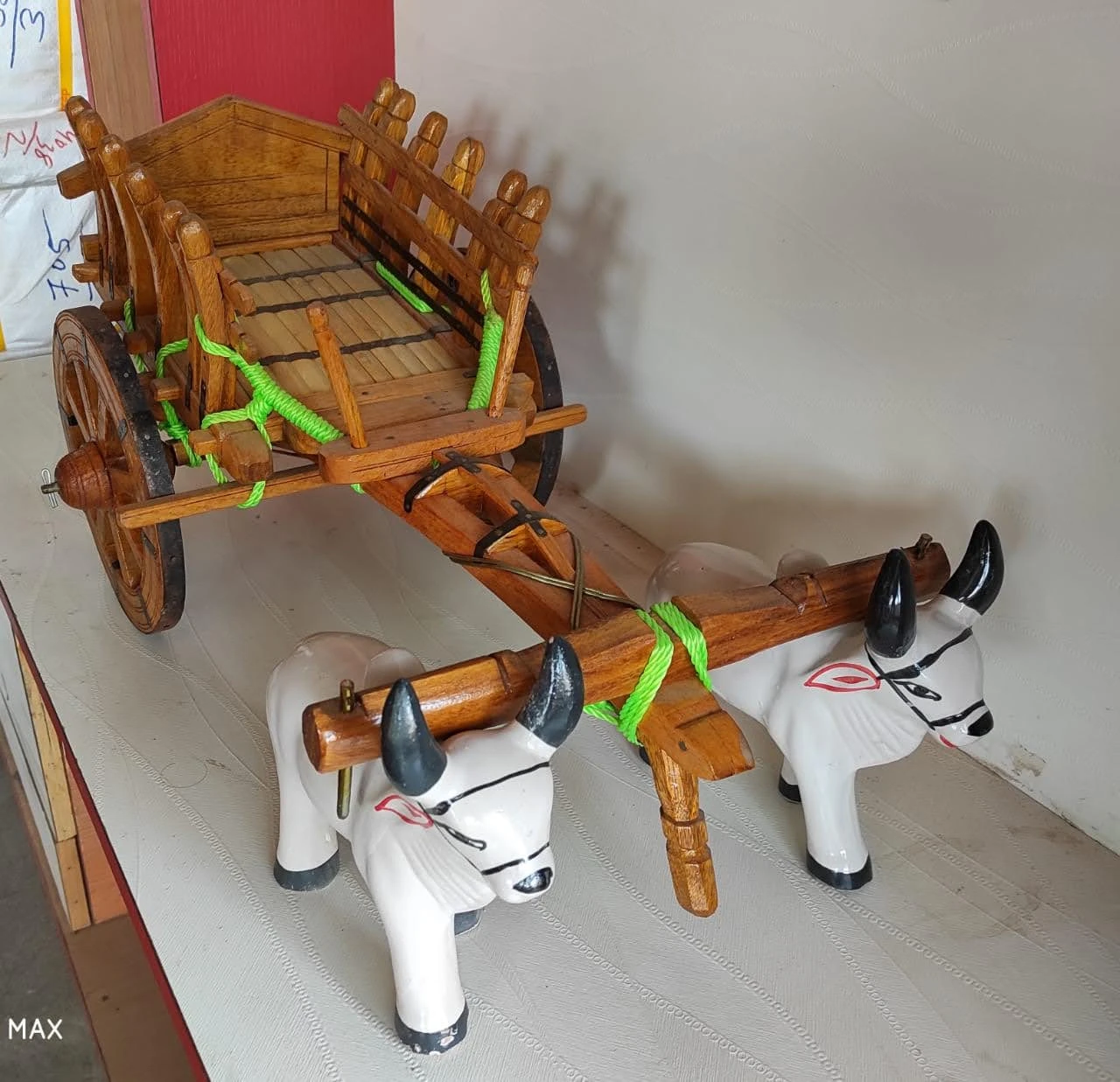 This wooden bullock cart is a symbol of India’s agricultural roots and adds a rustic charm to any space.