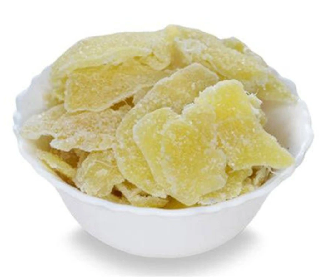 A sweet ginger slice, also known as candied ginger or dried ginger candy, is a chewy confectionery made from thin, tender slices of ginger root that have been simmered in a sugar solution, giving them a sweet and spicy flavor with a mild citrusy undertone and a chewy texture. These slices are often coated in a layer of coarse sugar, preserving the ginger's natural flavor and warmth while adding a delightful sweetness, and can be enjoyed as a standalone snack or used as a versatile ingredient in various dishes and baked goods.