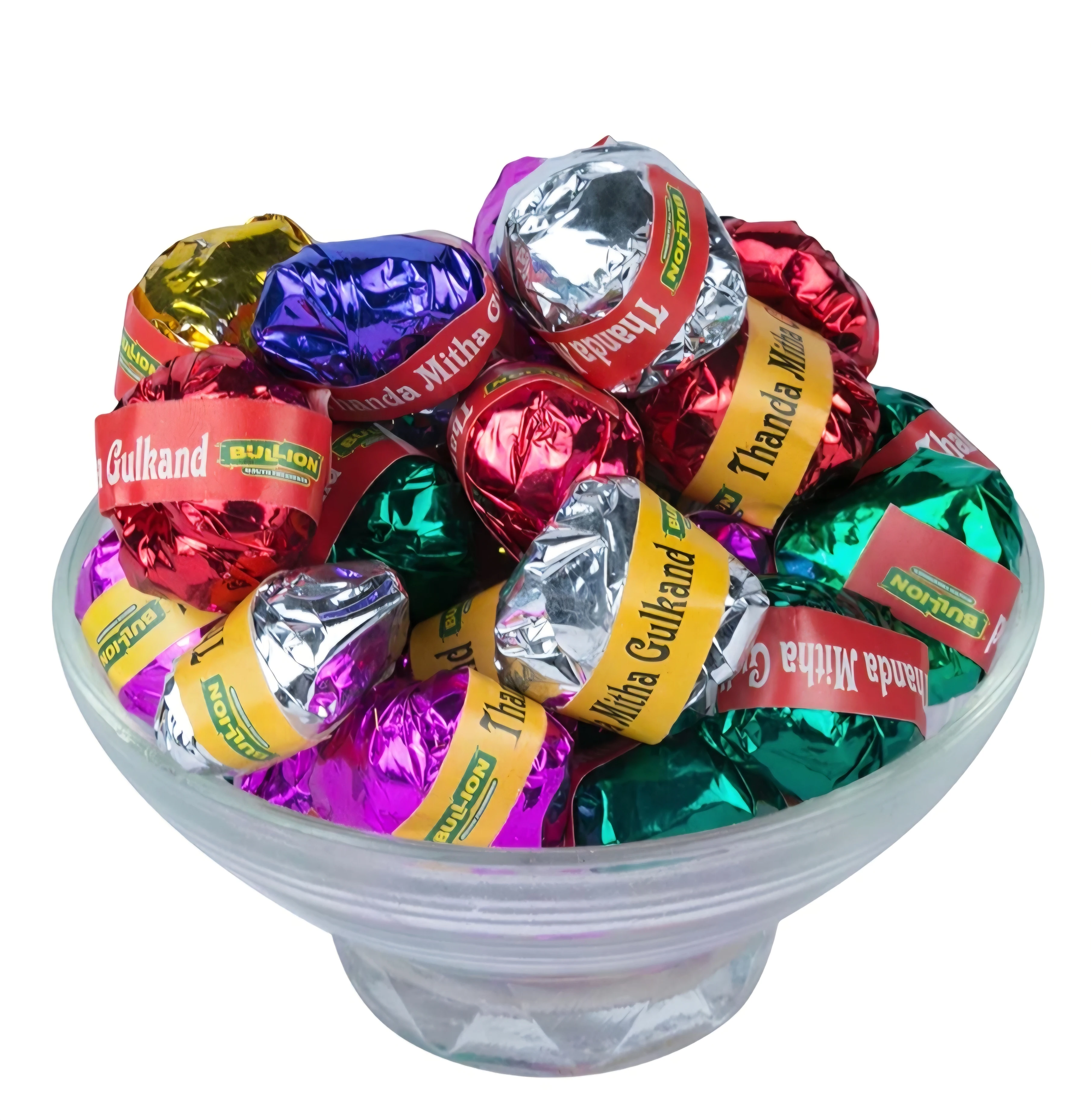 Thanda Mitha Paan (Cool Sweet Betel Leaf) is a popular Indian sweet, post-meal mouth freshener and digestive, blending sweet gulkand (rose petal preserve) with cooling ingredients like fennel (saunf), menthol, and sugar-coated seeds, often with candied fruits (tutti frutti, dates) and sometimes aromatic spices, delivering a refreshing, sweet, and minty flavor for fresh breath and digestion.
