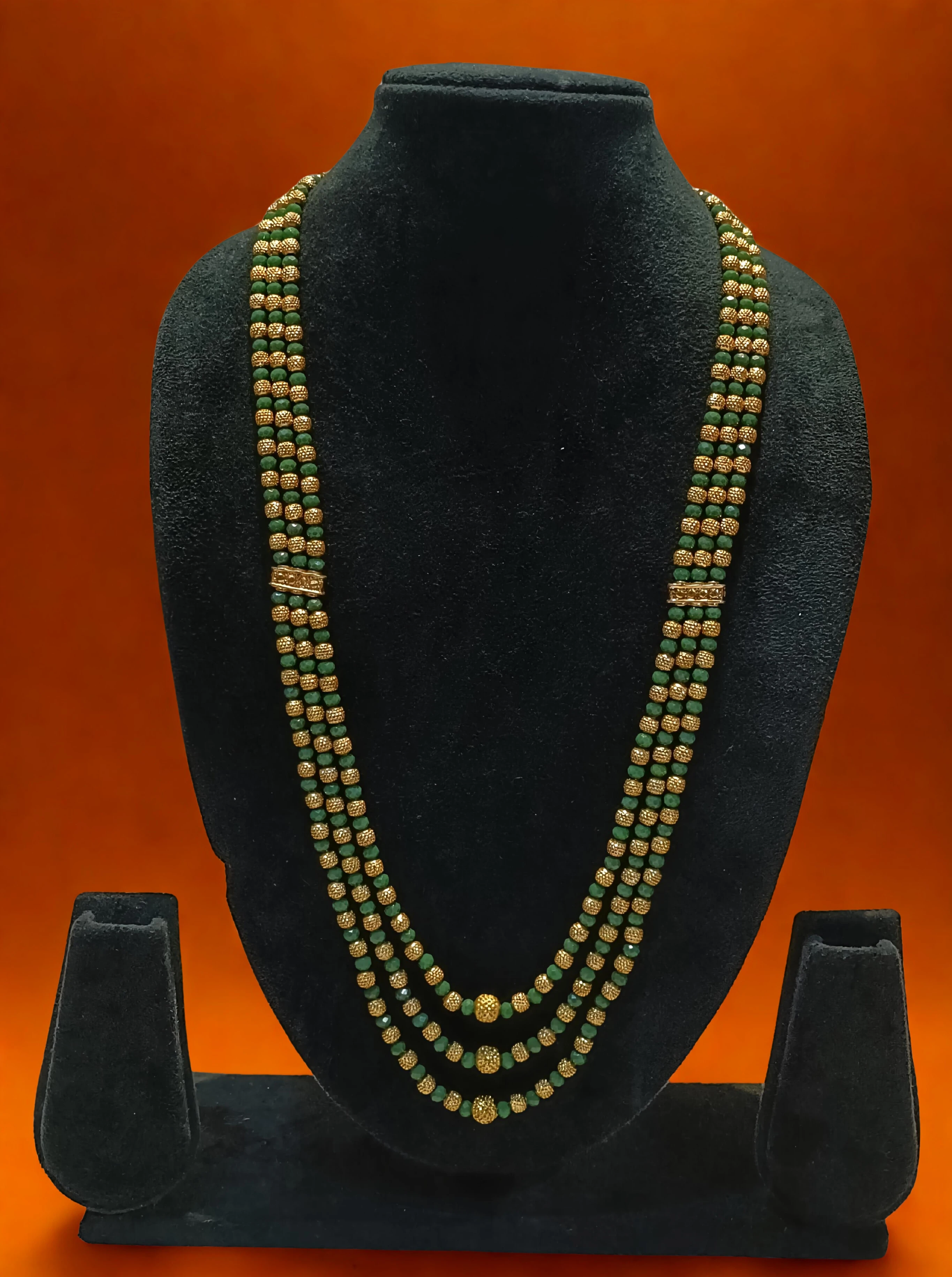 Add a touch of timeless tradition to your spiritual ensemble with this 3-layer Bormala, expertly handcrafted using shimmering green crystals and micro gold-plated copper beads. Perfect for traditional events, poojas, or daily spiritual wear, this Bormala reflects rich cultural heritage and devotion.