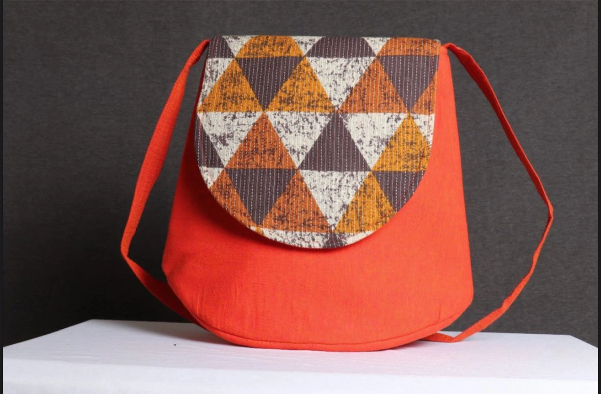 Add a pop of vibrant energy to your wardrobe with the Ubhare Bags Geometric Kantha Quilted Sling Bag, a stunning example of sustainable Indian craftsmanship. This eco-friendly sling bag is meticulously hand-stitched using the traditional Kantha quilting technique, featuring a bold terracotta orange base layered with intricate multi-tone triangular geometric patterns in earthy shades of rust, mustard, and charcoal on upcycled cotton fabric. The flap-over design ensures easy access, while the adjustable cotton strap provides versatile crossbody or shoulder wear for all-day comfort.