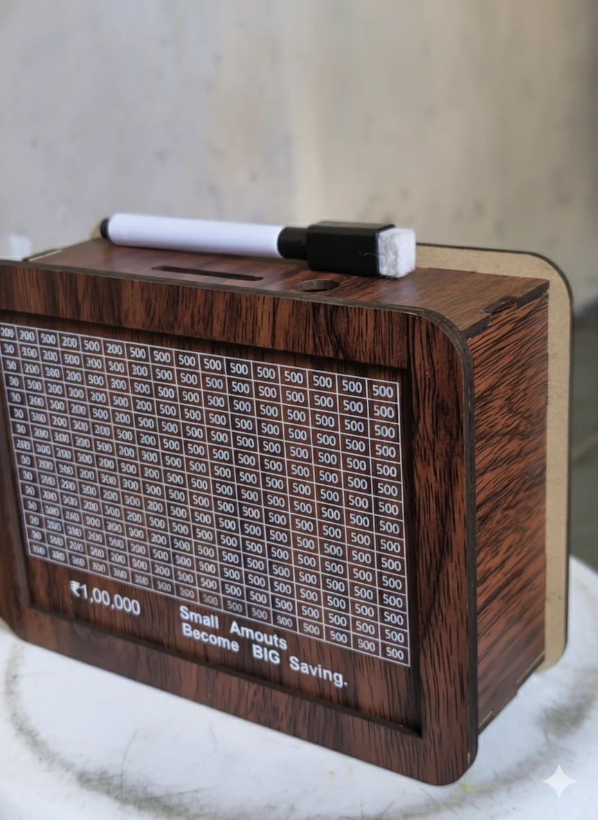 वस्तूचे नाव (Item Name) ​1 लाख मनी बँक (1 Lakh Money Bank) किंवा लाकडी बचत बॉक्स (Wooden Saving Box) ​2. मुख्य वैशिष्ट्य (Key Feature) ​हा एक लाकडी बॉक्स आहे, ज्यावर \text{₹1,00,000} वाचवण्याचा एक ट्रॅकर (Tracker) छापलेला आहे. ​3. नोटा आणि ट्रॅकिंग तपशील (Note and Tracking Detail) ​बॉक्सच्या दर्शनी भागावर (front side) अनेक लहान रकमा (Denominations) छापलेल्या आहेत, जसे की \text{₹50}, \text{₹100}, \text{₹200}, आणि \text{₹500}. ​या सर्व रकमांची बेरीज (\text{Total}) \text{₹1,00,000} होते. ​जेव्हा तुम्ही बॉक्समध्ये पैसे टाकता, तेव्हा तुम्ही टाकलेल्या रकमेवर (\text{Deposit Amount}) मार्कर पेनने खूण (Mark/Circle) किंवा \text{Tick} करता. ​यालाच 'पीक एडिट' (Peak Edit) असे म्हणतात, कारण तुम्ही प्रत्येक वेळी किती पैसे वाचवले याची नोंद (Note Detail) ठेवता. ​अशाप्रकारे, तुम्ही \text{₹1,00,000} चे लक्ष्य पूर्ण केले की नाही, हे तुम्हाला दृश्य स्वरूपात (Visually) ट्रॅक करता येते. ​4. ध्येय (Goal) ​बॉक्सवर "Small Amounts Become Big Savings" (लहान रकमा मोठ्या बचतीत बदलतात) हा संदेश दिलेला आहे. हे बचतीची सवय लावण्यासाठी एक प्रेरणास्त्रोत (Motivational Tool) म्हणून काम करते.